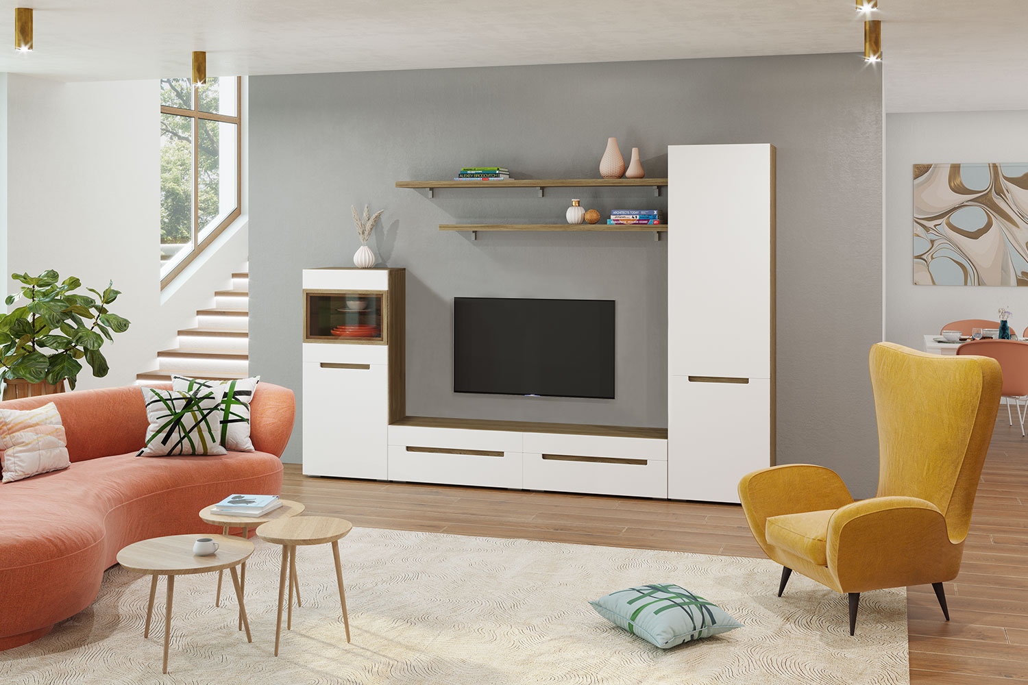 - Гостиная Анри понравится современным жителям большого города, которые устали от суеты каменных джунглей. Заядлые киноманы смогут смотреть фильмы в приятной обстановке (домашний кинотеатр на широкую тумбу под ТВ), а фанаты литературы легко разместят любимые книги на стеллаже и верхних полках.