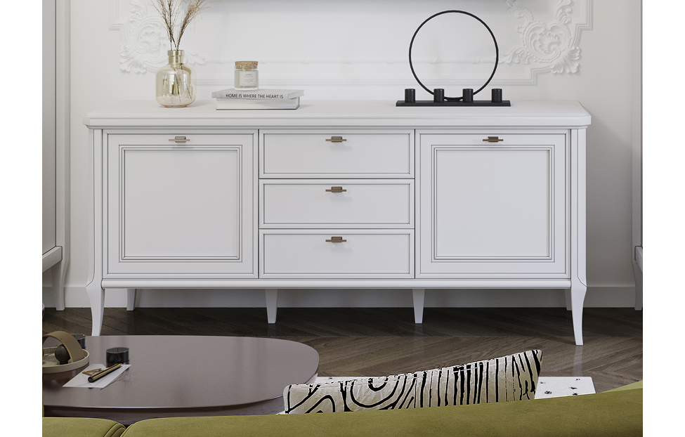 - Комод с 3 секциями: крайние секции комода — отделения с одной съемной щитовой полкой за распашными фасадами;
