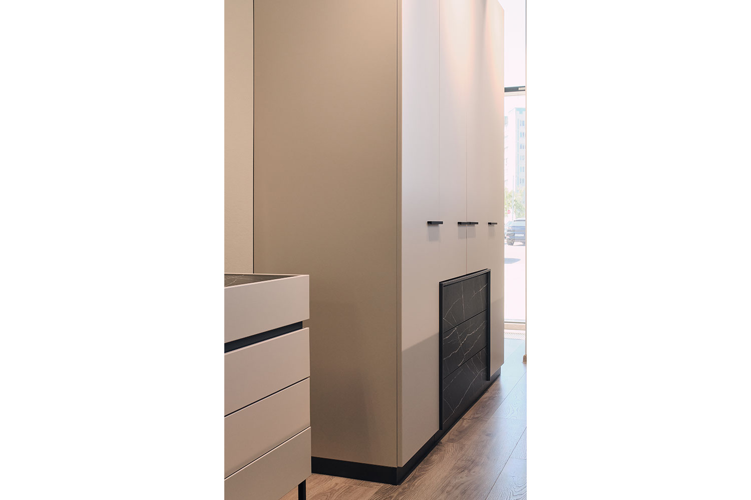 Все модули гармонично сочетаются друг с другом. Черный акцентный мрамор добавляет коллекции изысканности и роскоши, а выразительная геометрия тонких черных ручек на фасадах, перетекающая в линию опор, придают ей современный вид.